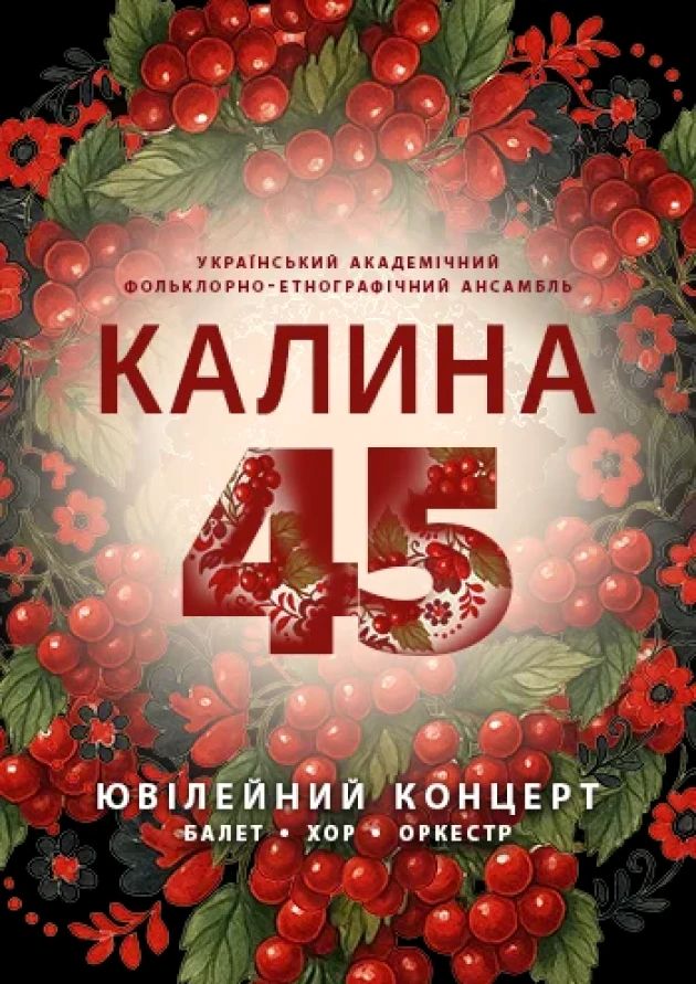 «Калина» — знаний в Україні та за її межами творчий ансамбль, який уже багато років популяризує українську культуру, поєднуючи автентичний фольклор із сучасними сценічними рішеннями. У програмі концерту — найкращі вокальні, хореографічні та інструментальні номери з репертуару колективу, улюблені постановки глядачів, а також прем’єрні композиції.