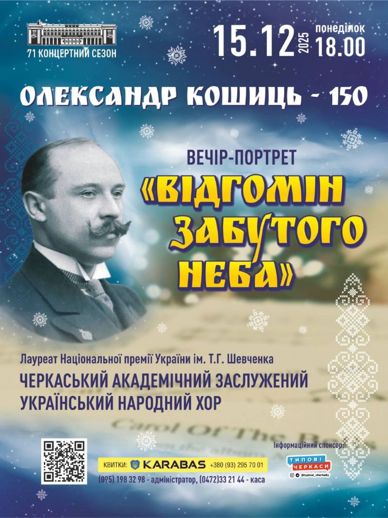 На початку циклу різдвяно - новорічних свят Черкаська обласна філармонія присвячує особливий мистецький вечір постаті, чия творча сила відкрила Україну світові. Про звідане та незвідане — про постать Олександра Кошиця — хормейстера-диригента із казковим талантом, композитора, кандидата богослов’я, культурного діяча початку 20 століття, який стоїть у витоків формування української національної музичної школи, - вже 15 грудня на вечорі - портреті