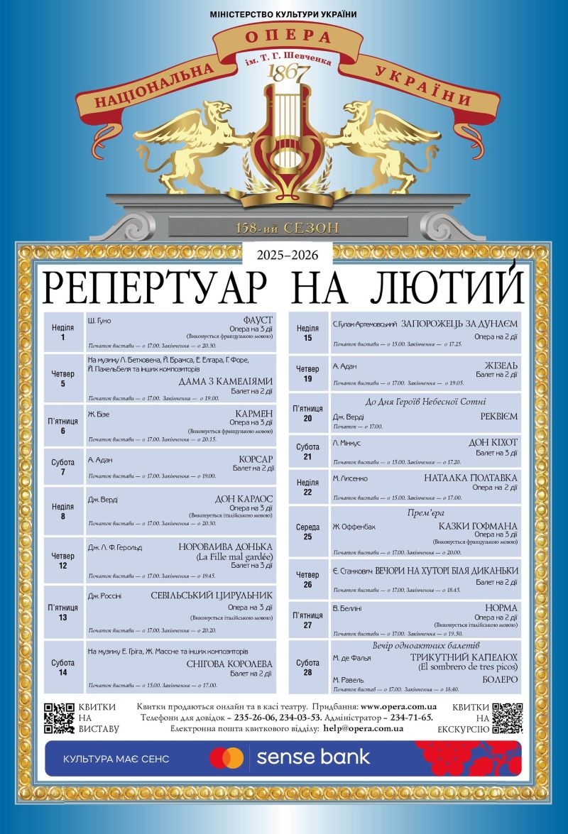 15 лютого (неділя) о 15:00 — безсмертний шедевр української класики опера Семена Гулака-Артемовського «Запорожець за Дунаєм» в музичній редакції Мирослава Скорика, сценічна редакція Анатолія Солов’яненка.