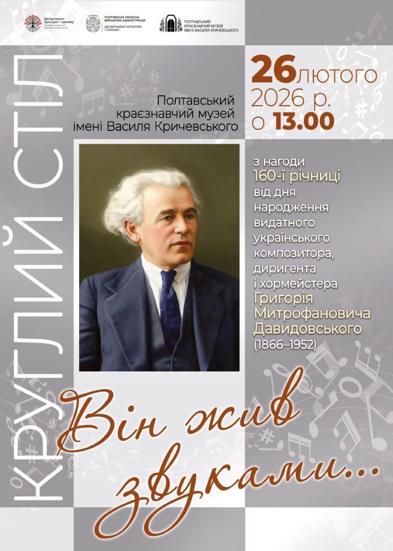 26 лютого у Полтавському краєзнавчому музеї імені Василя Кричевського відбудеться круглий стіл «Він жив звуками…», присвячений 160-річчю з дня народження українського композитора, диригента й засновника хорових капел Григорія Давидовського.