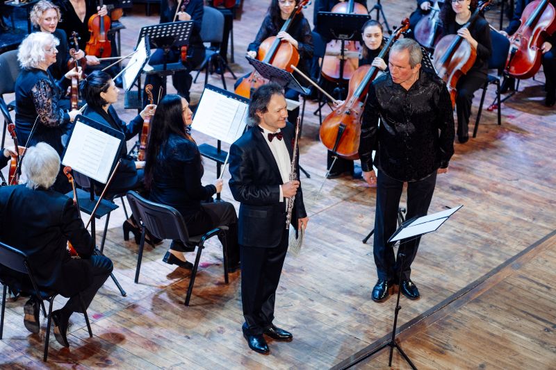 Перша частина концерту була присвячена музиці для флейти з оркестром. Солістом виступив Юрій Шутко — заслужений артист України, соліст Національної філармонії України, лауреат численних міжнародних конкурсів, єдиний в Україні музикант, що грає на золотій флейті японської фірми Sankyo та представляє її у світі. Юрій Шутко подарував насолоду музикою класичних композиторів. У його сольному виконанні під супроводом камерного складу оркестру прозвучали: Карел Стаміц — Концерт для флейти з оркестром, Соль мажор, тв. 29 (в 3 частинах), Вольфганг Амадей Моцарт — Рондо До мажор K. 373 (у перекладенні для флейти Ю. Шутка). Також у подарунок прозвучав відомий твір Й.С.Баха «Жарт» із оркестрової сюїти № 2 сі мінор, BWV 1067. Флейта постала не лише як технічно досконалий інструмент, а як живий голос — харизматичний, емоційно насичений, здатний передати радість, легкий смуток і навіть піднесену свободу. Ніжні, соковиті, проникливі, з благородним тембром звуки золотої флейти сяяли мов коштовний діамант.