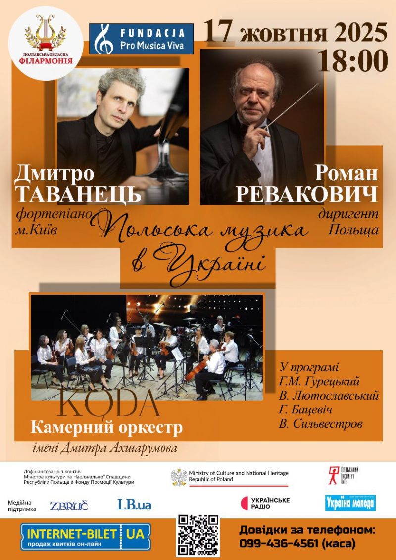 17 жовтня у Полтавської обласній філармонії відбудеться концерт "Польська музика в Україні". Камерний оркестр ім. Дмитра Ахшарумова під орудою диригента Романа Реваковича виконає твори твори польських комозиторів: Гражини Бацевіч, Мєчислава Карловіча, Вітольда Лютославського. Солістами будуть українські віртуози - піаніст Дмитро Таванець та скрипаль Андрій Павлов.