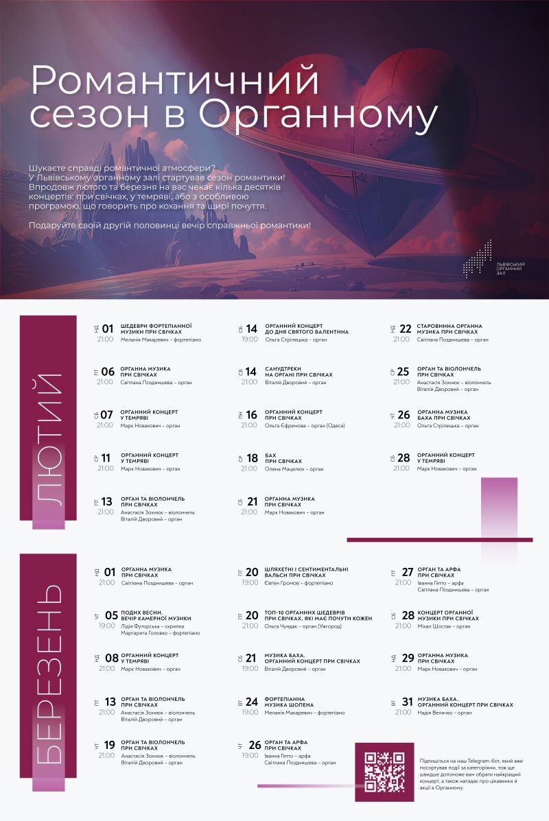 У лютому Органний зал пропонує серію вечірніх концертів, створених спеціально для романтичної атмосфери: з приглушеним світлом, сотнями свічок і живою музикою. У програмі – органні концерти при свічках, події у темряві, поєднання органа й віолончелі, а також спеціальні концерти до Дня святого Валентина.